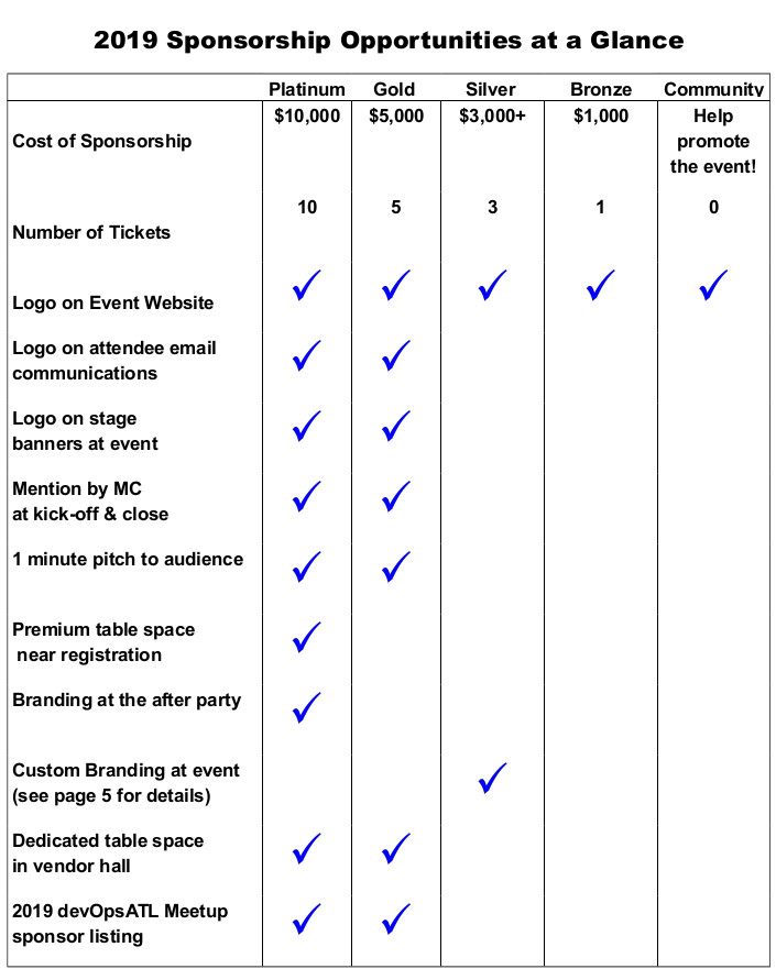 Platinum & Gold sponsors will be listed as devOpsATL Meetup sponsors for 2019 & included in our meetup e-mail communications.