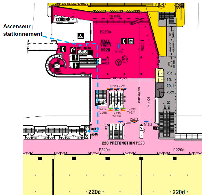 See the path from the parking elevator to the elevator leading to the 5th floor.